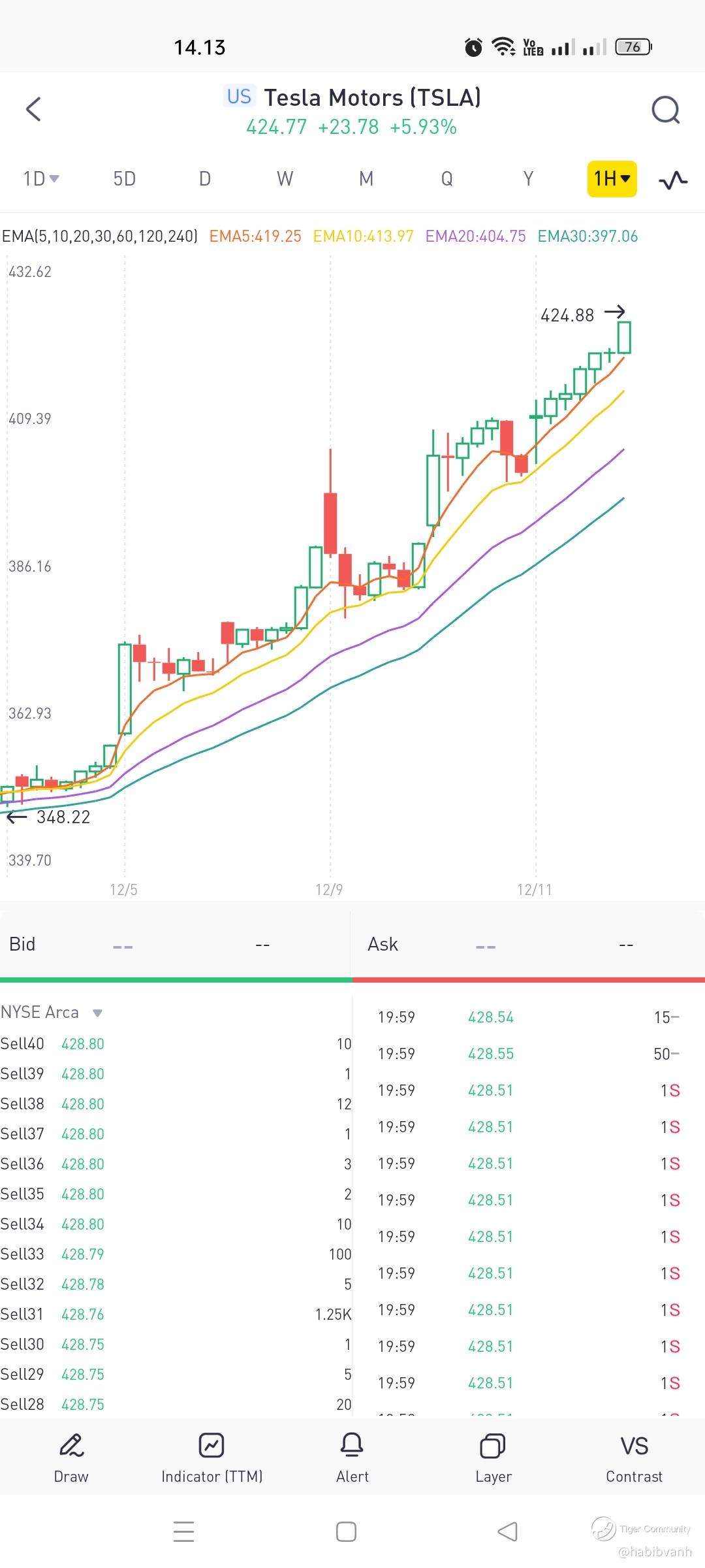 Tesla shares rose to a high of $424.77. The stock price is $15 higher than its previous high of $409.97 on November 4, 2021.