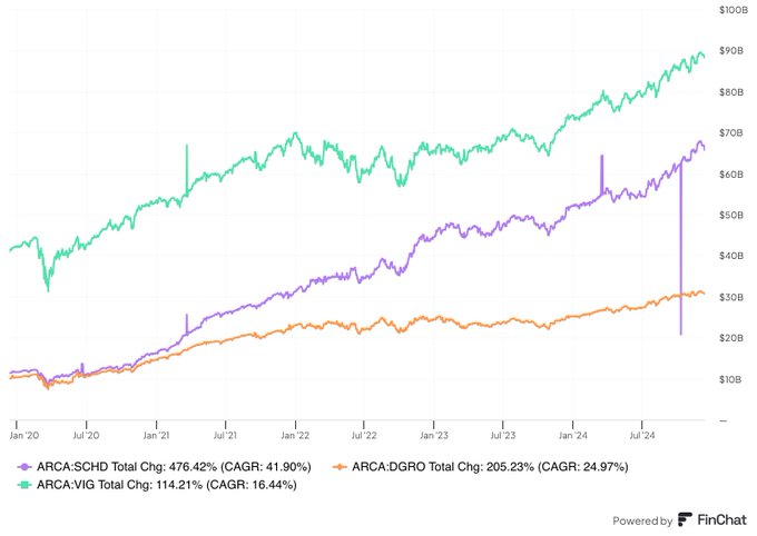 The assets under management for $Schwab US Dividend Equity ETF(SCHD)$ has grown by 40% each year over the past 5 years. This is nearly double that of $iShares Core Dividend Growth ETF(DGRO)$ and about 2.5x that of $Vanguard Dividend Appreciation ETF(VIG)$ .