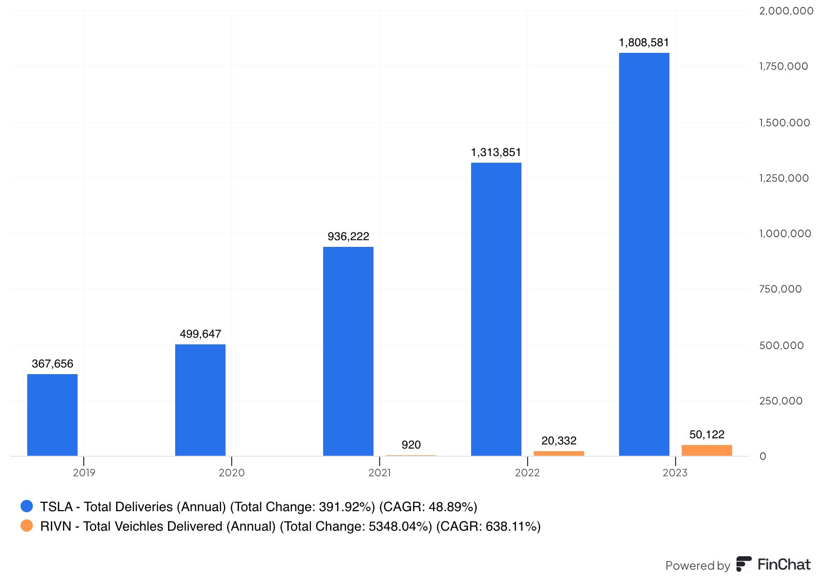 $Tesla Motors(TSLA)$ has quite the lead on $Rivian Automotive, Inc.(RIVN)$ in terms of total deliveries per year.