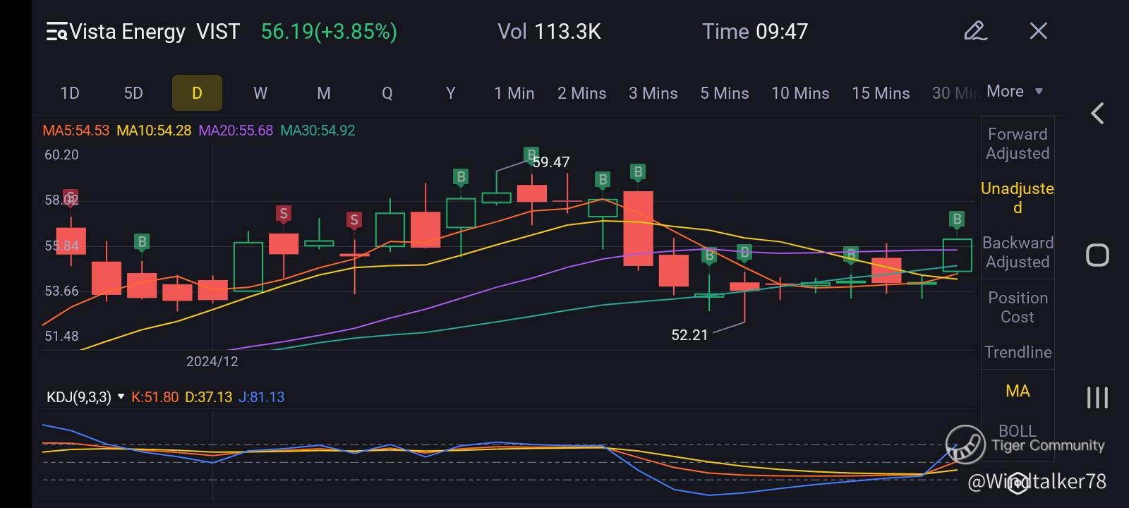 $Vista Energy(VIST)$ Added more over the days when MA5 levelled out. Potential uptrend and reversal with 3.85% gain at the start of the day. Looking for more growth towards 60 plus level.