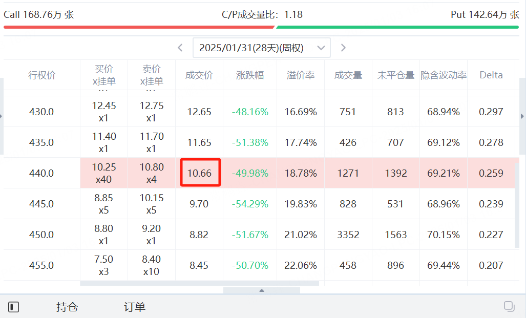 1. Sell one call option with a strike price of $440, expiring on January 31, for $10.66 per share, generating $1,066 in premium income.