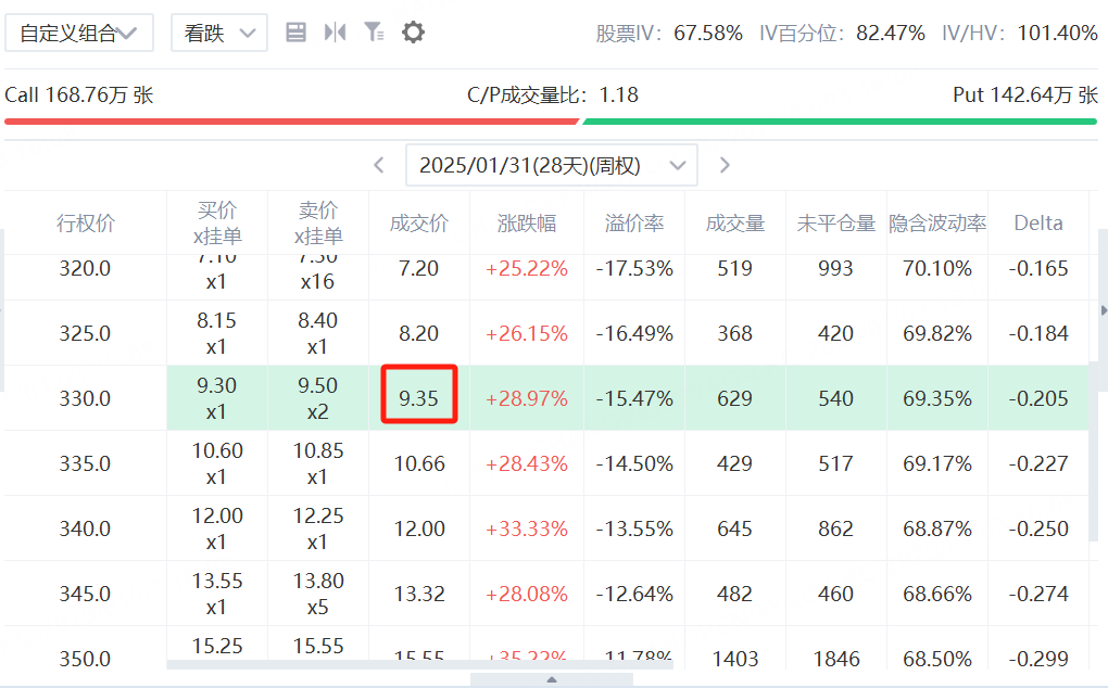 2. Buy one put option with a strike price of $330, also expiring on January 31, for $9.35 per share, costing $935.