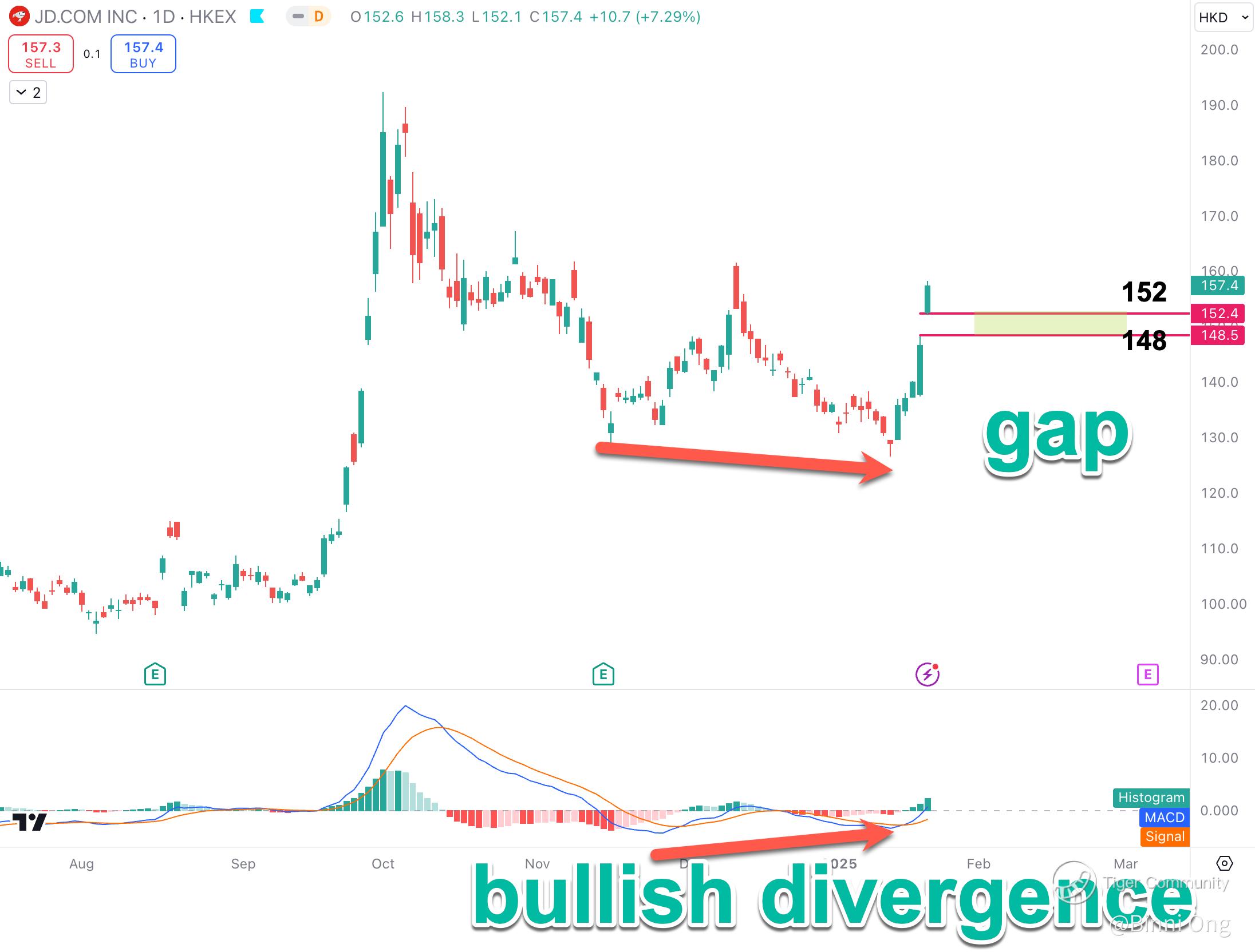 For bullish opportunities, such as the current uptrend supported by the MACD bullish divergence and gap breakout, traders can use long DLCs (e.g $JD 5xLongSG251113(DWYW.SI)$ ) to capitalize on upward momentum.
