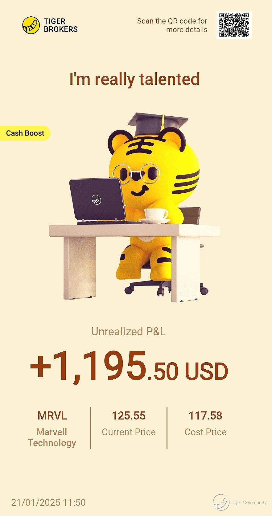 $Marvell Technology(MRVL)$ Wrapped up a solid little profit with MRVL today! Marvell’s been showing some strong performance lately, especially with their focus on data centers and 5G. Seeing their ongoing tech innovations really makes me think they’ve got huge potential ahead. Big thanks to CBA for the smooth support—definitely helped make this trade easier!