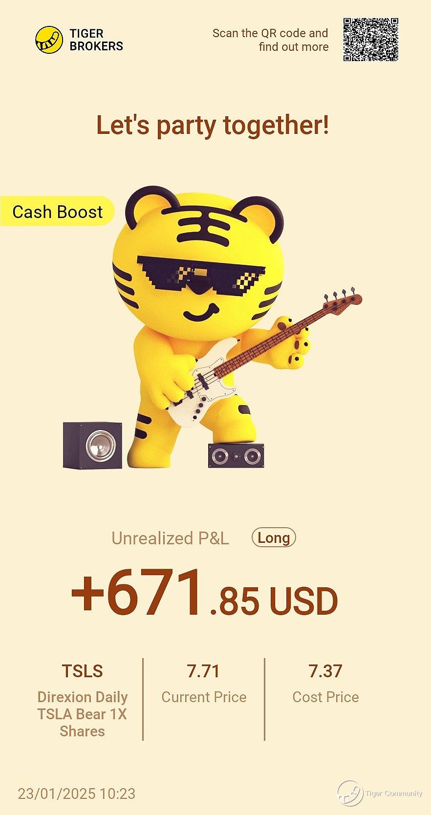 $Direxion Daily TSLA Bear 1X Shares(TSLS)$ I’m beyond thrilled recently! Took advantage of Tesla’s volatile price action and invested in Direxion Daily TSLA Bear 1X Shares, which showed steady gains after a minor pullback, resulting in a satisfying profit. This inverse ETF moves opposite to Tesla’s daily performance, making it a great tool for short-term hedging or capitalizing on market downturns. Tesla’s recent volatility, particularly ahead of its earnings report, created an ideal environment for TSLS to shine, giving me a chance to profit amidst Tesla’s ups and downs!