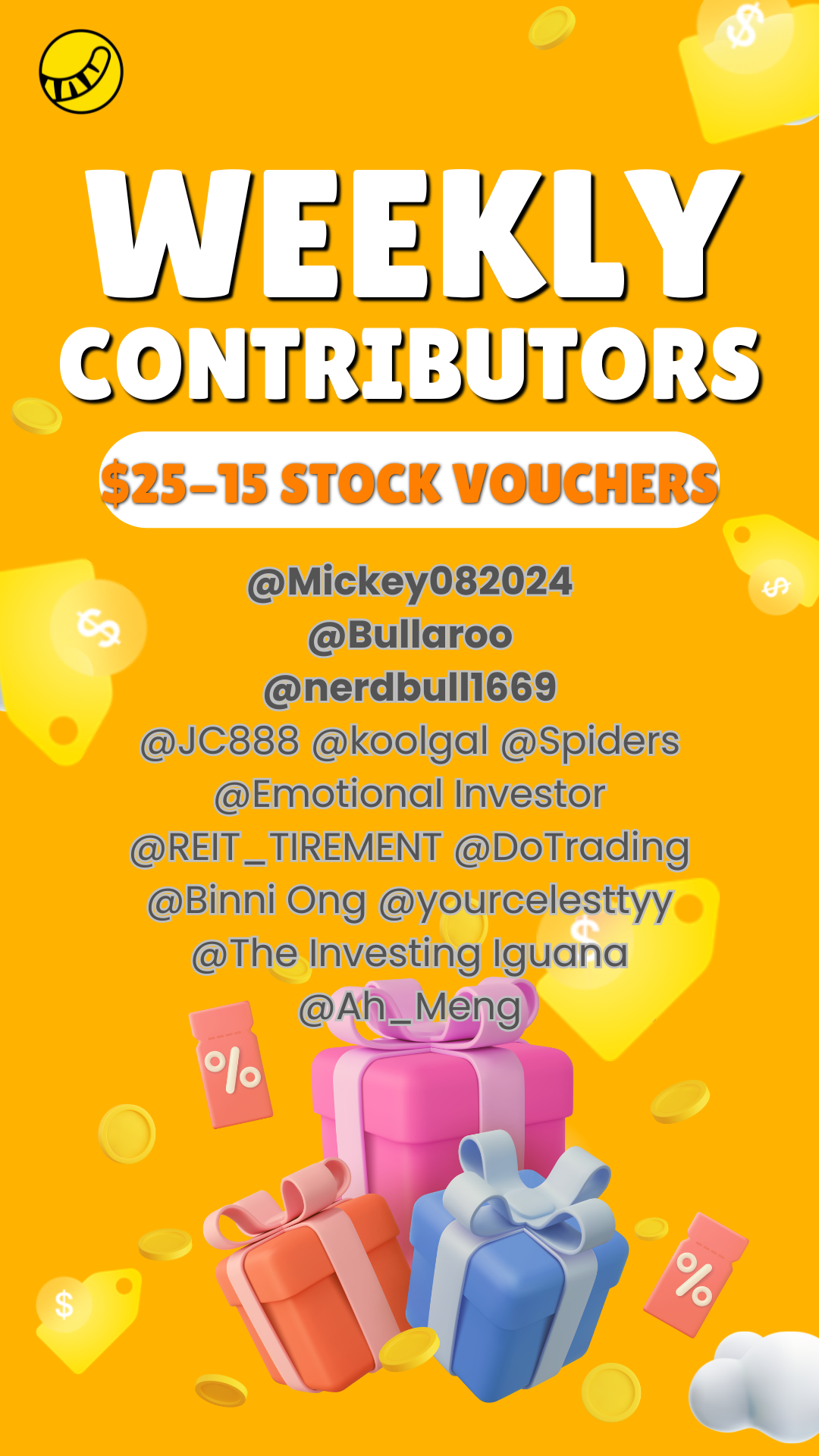 - nerdbull1669Β·03-31TOPthank you @TigerStars for the stock voucher, congrats to all winners! Do exercise caution and feel the pulse of market while seeking good discount of good quality stocks! Happy Trading Everyone!1Report