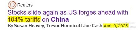 This about turn came after Trump decided to carry out his threat to impose a further +50% tariffs (totaling a ridiculous +104%) on China, with effect from Wed, 09 Apr 2025. (see above)