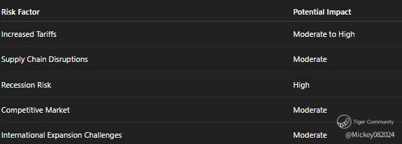 This table outlines the key risks that Celsius faces as it continues to grow, including the potential impact of increased tariffs, supply chain challenges, and recession risks.