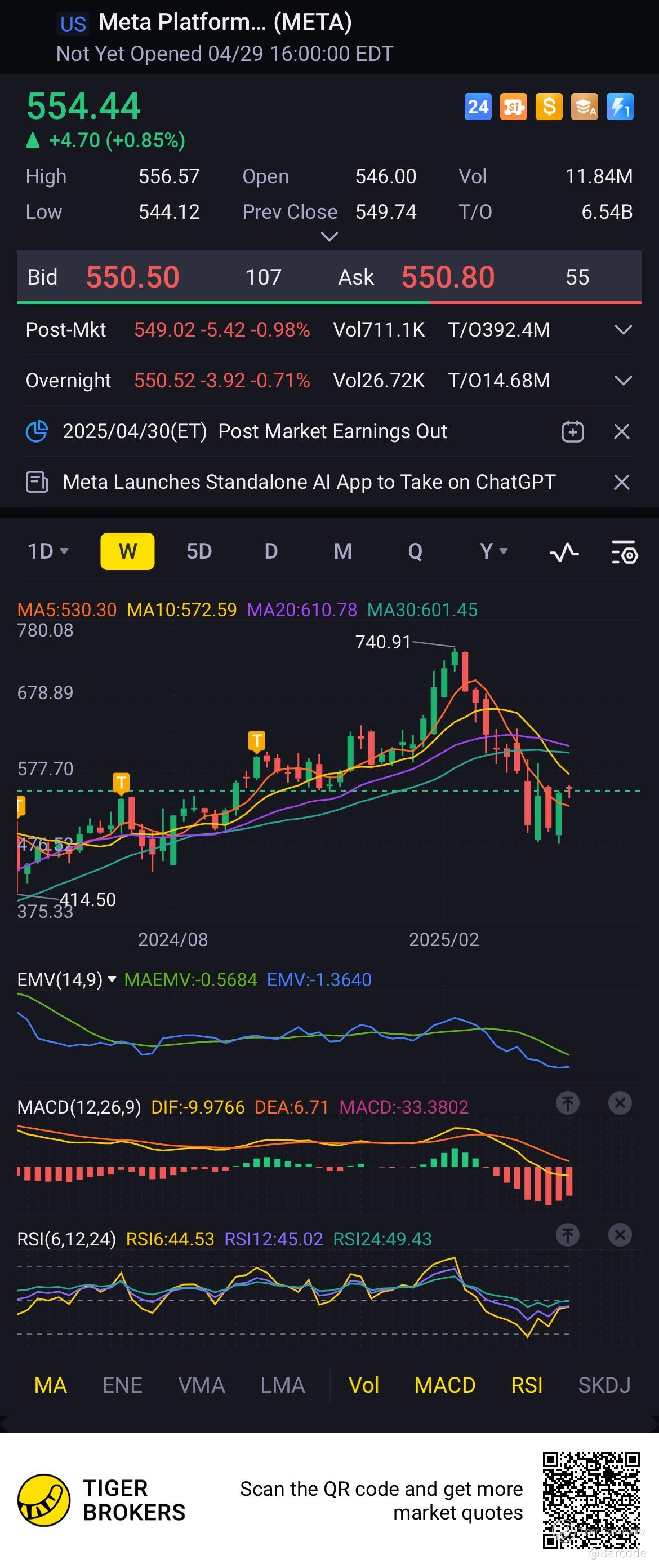 📉 Meta stock closed at $554.44 (+0.85%), but slipped in post-market to $549.02 (–0.98%) ahead of earnings due 30Apr25, 🇺🇸US time