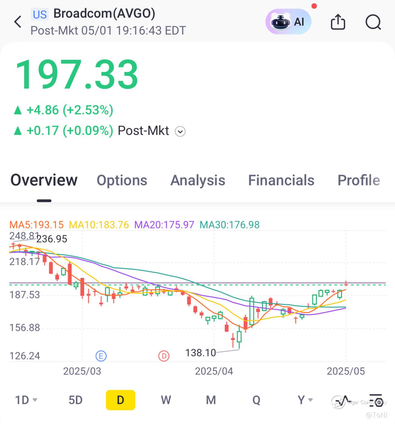 Broadcom Inc. (ticker: AVGO) stands out as a powerhouse in the semiconductor and infrastructure software sectors, making it a compelling investment choice. As a key player in AI, cloud computing, and 5G technologies, Broadcom not only demonstrates robust growth potential but also offers financial stability and a forward-thinking strategy that has captured the attention of investors. On May 1, 2025, Broadcom closed at $197.33, marking a 2.53% daily gain, with an additional 0.09% increase in after-hours trading, reflecting sustained market confidence. I am strongly bullish on this stock, and here’s why.