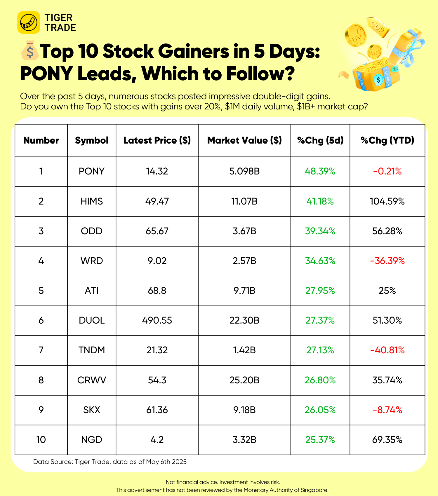 💰Top 10 Stock Gainers in 5 Days: PONY Leads, Which to Follow?