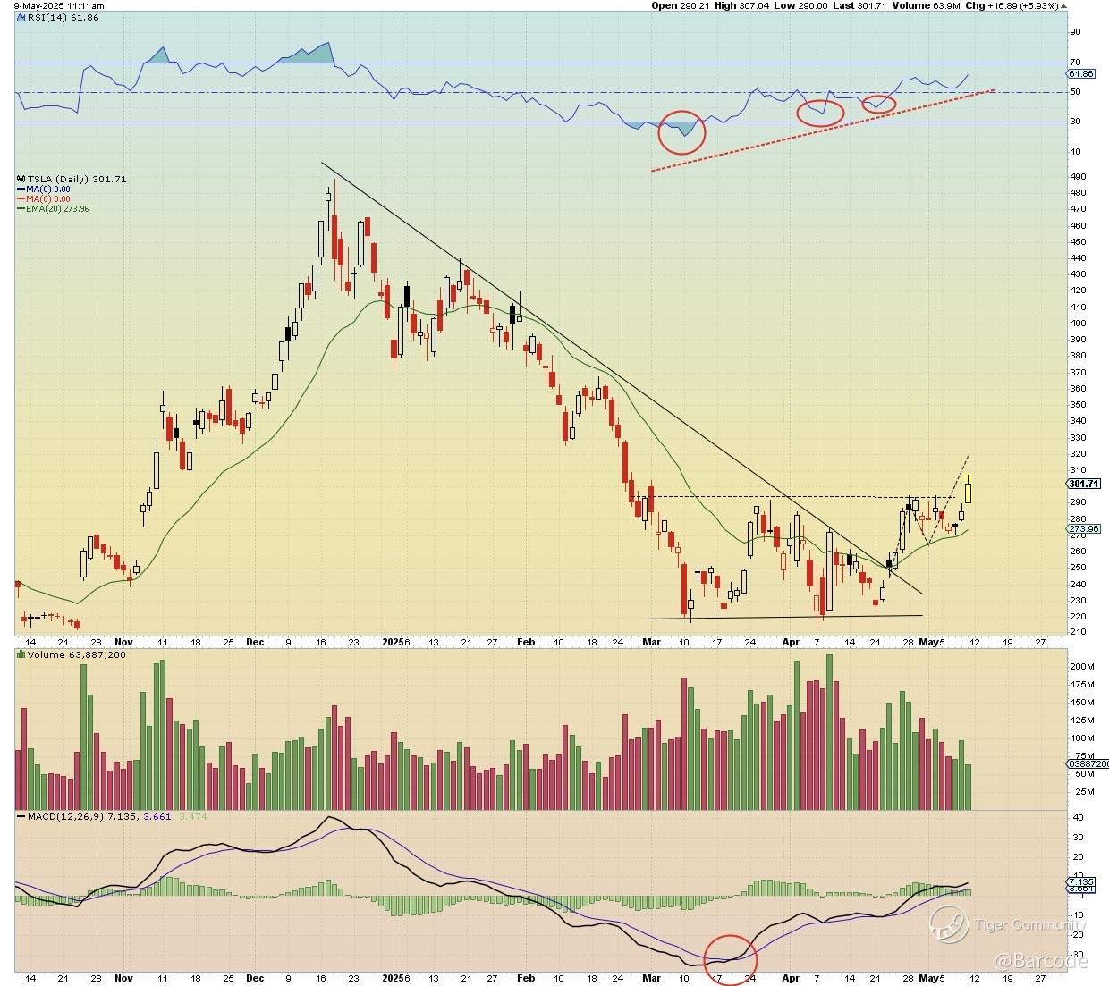 Tesla is currently trading above $300, with real-time volume climbing past 50M shares intraday. The RSI sits above 60, MACD has crossed bullishly since late April, and price action confirms a clean break above the descending trendline from the Feb24 highs.