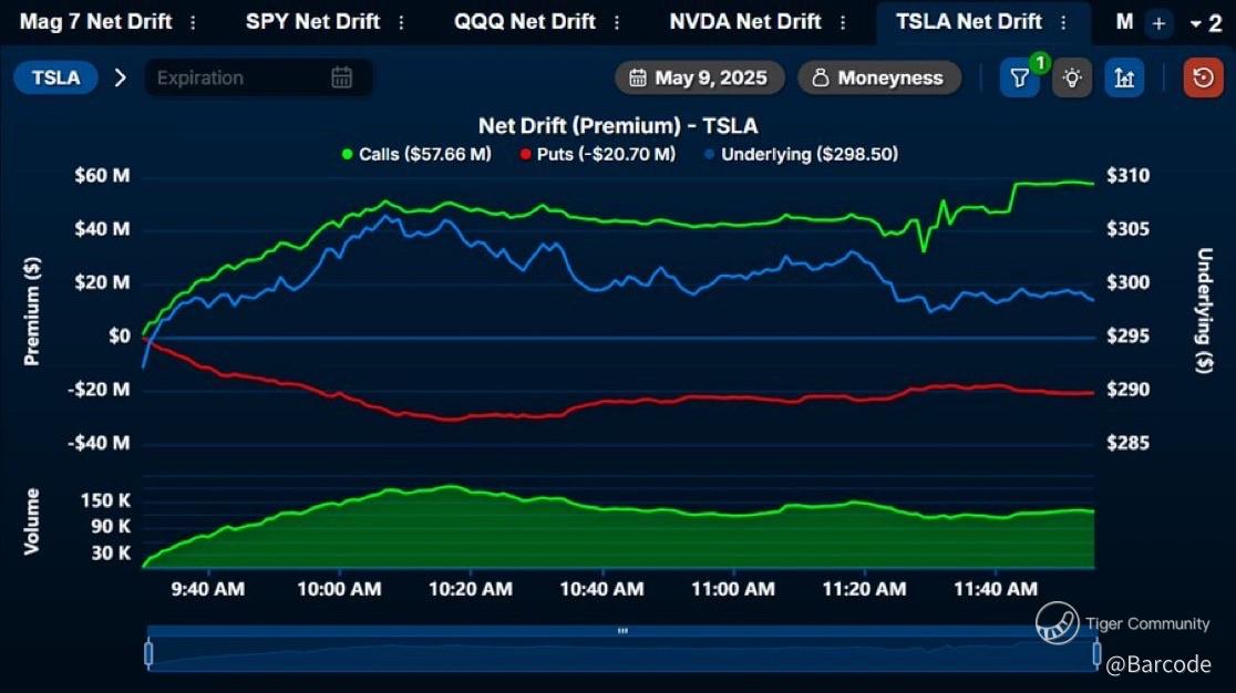 As of the last reported hour, $TSLA options flow is heavily skewed bullish. Over $57 million in call premium versus roughly $20 million in puts. Net flow is drifting upward with open interest building at the $305 and $310 levels. Institutional players are targeting far OTM calls, with July and September expiries increasingly active. This isnβt short-dated gambling. This is strategic positioning for sustained upside.