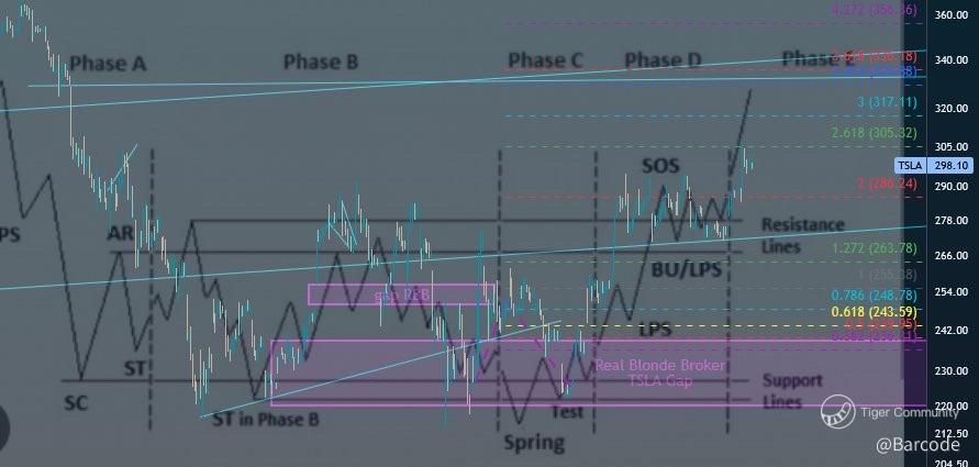 Layered onto this is a textbook Wyckoff schematic. TSLA is in Phase E, the markup phase, post-spring and post-accumulation. Here’s the full breakdown: