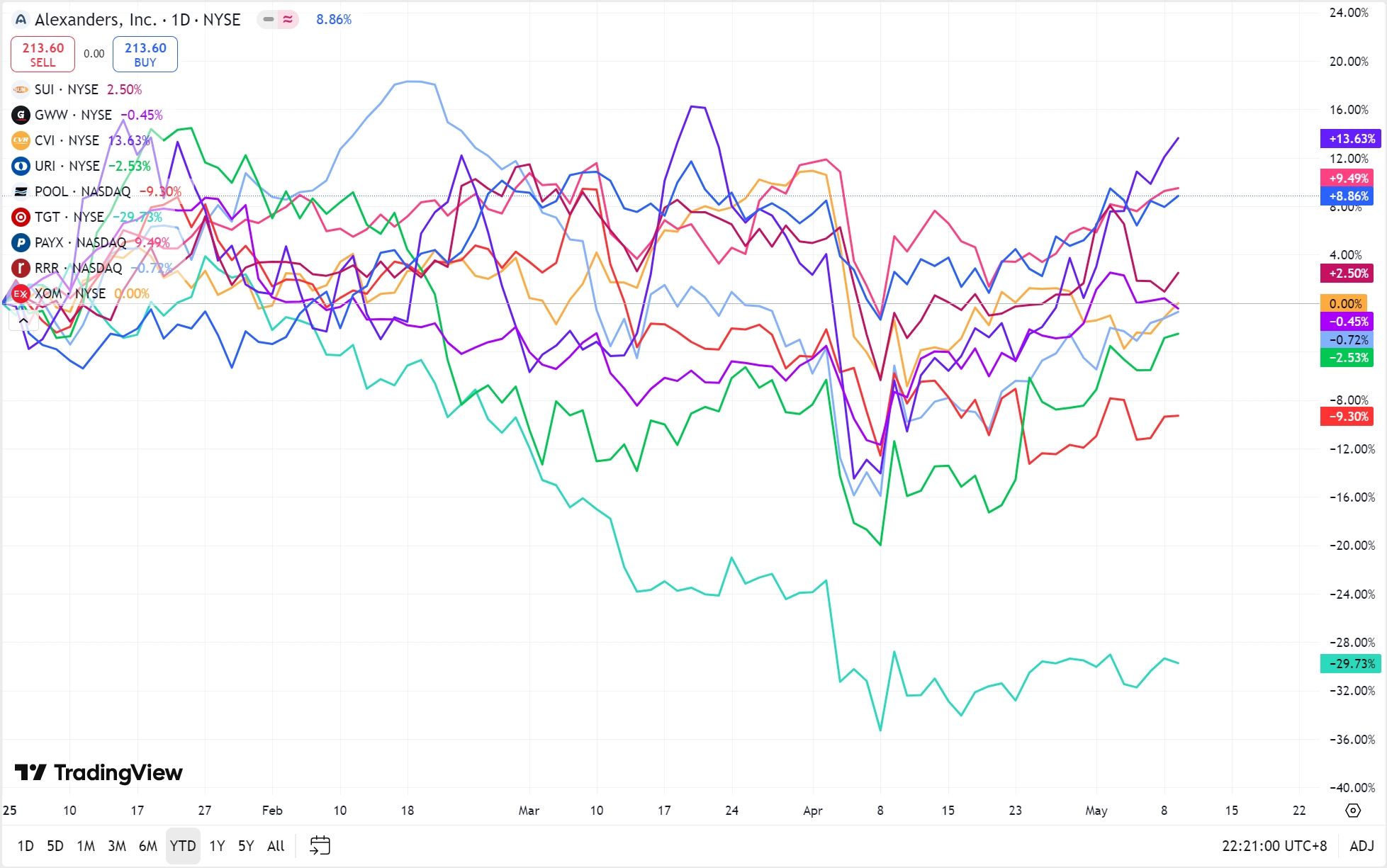 TradingView data from 2025 showed that stock prices rose for $Alexander's(ALX)$ , $Sun Communities(SUI)$ , $CVR Energy Inc(CVI)$ and $Paychex(PAYX)$ , while shares of $W.W. Grainger(GWW)$ , $United Rentals(URI)$ , $Pool(POOL)$ , $Target(TGT)$ , and $Red Rock(RRR)$ moved lower. Meanwhile, $Exxon Mobil(XOM)$ remained largely unchanged.