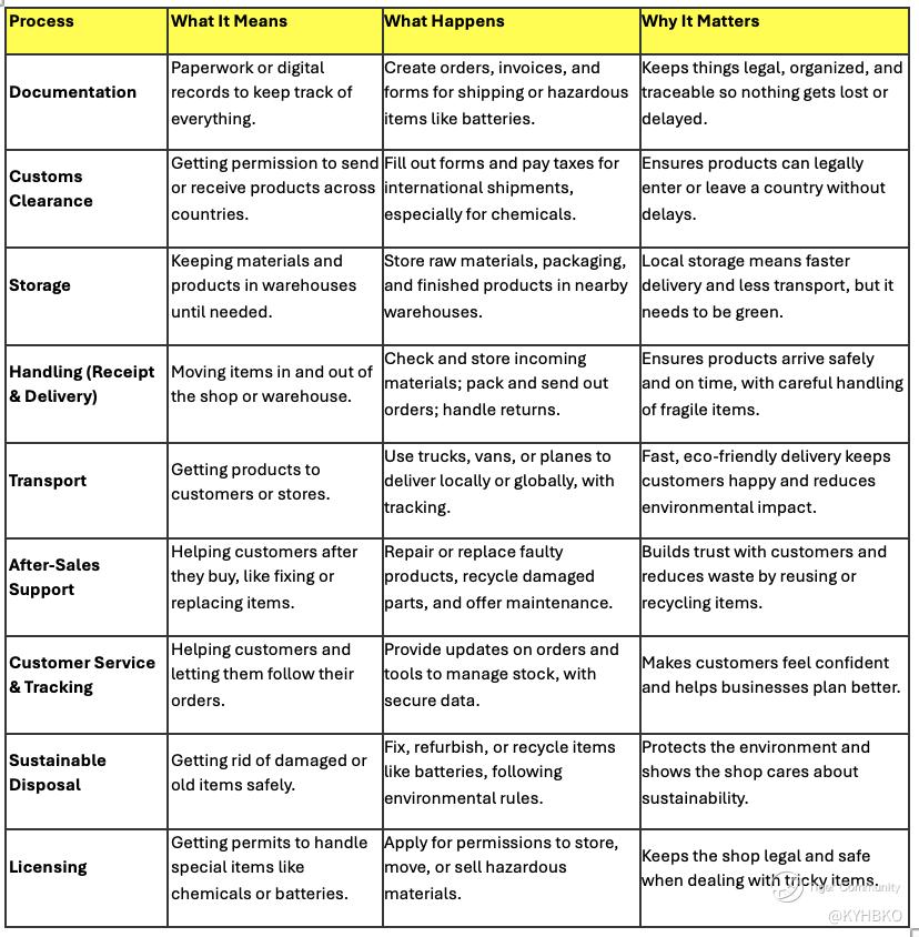 For a shop that makes and sells products, the logistics process is like a well-organised system to get things from raw materials to customers’ hands and support them afterwards. It involves several steps, such as buying materials, making products, storing them, delivering them, and handlingreturns or repairs. At the local level, this gets trickier because you need nearby warehouses, careful handling, and paperwork to keep things moving smoothly. The goal is to deliver products quickly, keep costs low, and be eco-friendly by minimising waste and carbon emissions. Customers also want to track their orders easily, and the shop needs to manage damaged items responsibly, especially hazardous ones like batteries.
