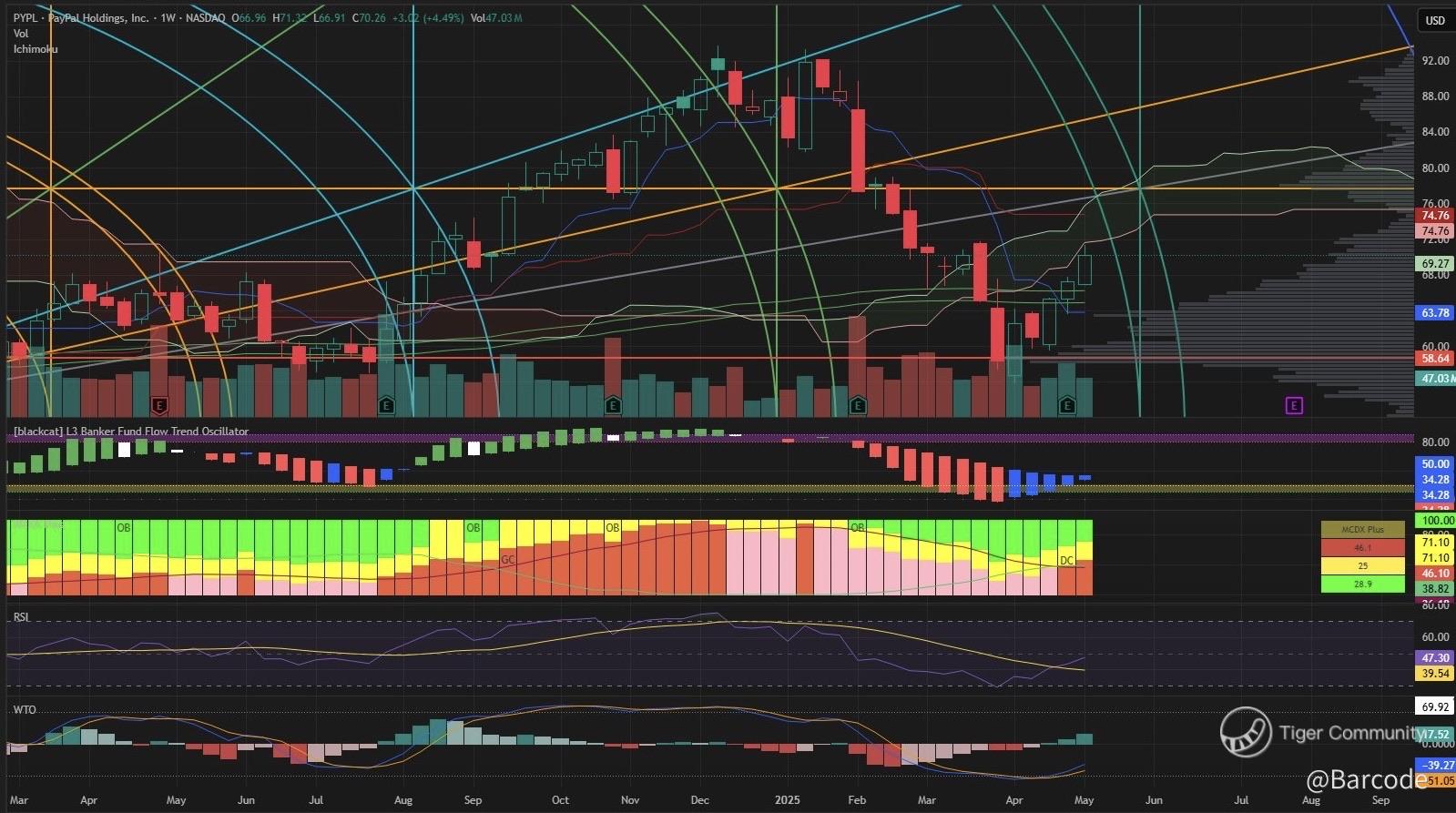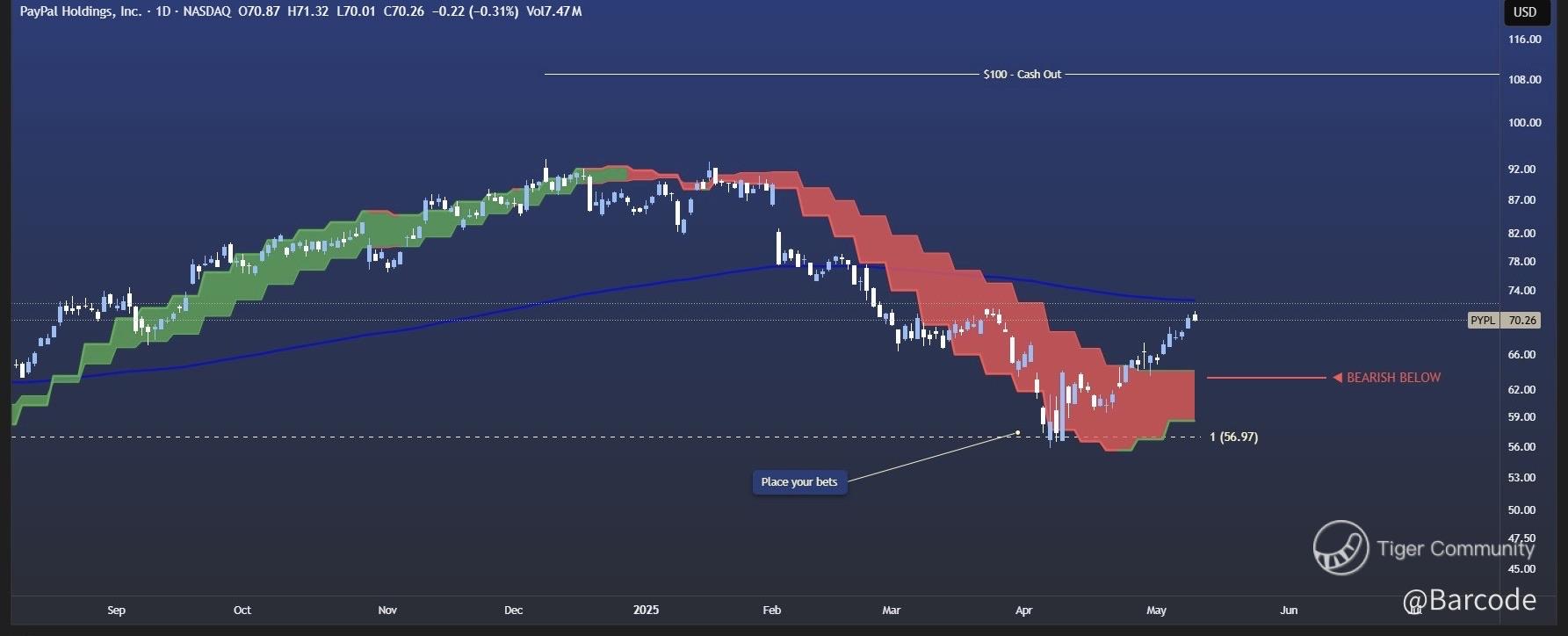 On the daily, $PYPL has surged back into the TrendCloud with conviction, reclaiming $70 and pressing toward the critical $72 threshold. The aggression required to re-enter the cloud from below speaks volumes. This wasnโt drift, it was intent. Momentum-backed volume confirms it. The $72 zone remains the immediate test, and above it lies open air.