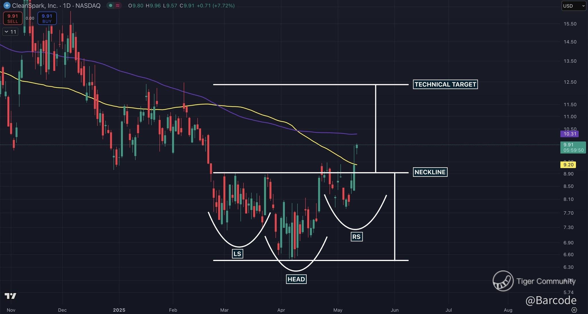 $CLSK has activated a textbook inverse head and shoulders formation, with a confirmed neckline break at $9.20. This classic reversal structure, defined by three successive troughs and a rising neckline, projects a measured technical target of $12.00, implying +25% upside from current levels. Following a +6.95% pre-market surge, CleanSpark is now trading at $9.55 (+3.80%) in open-market trading on 13May25, 🇳🇿NZST