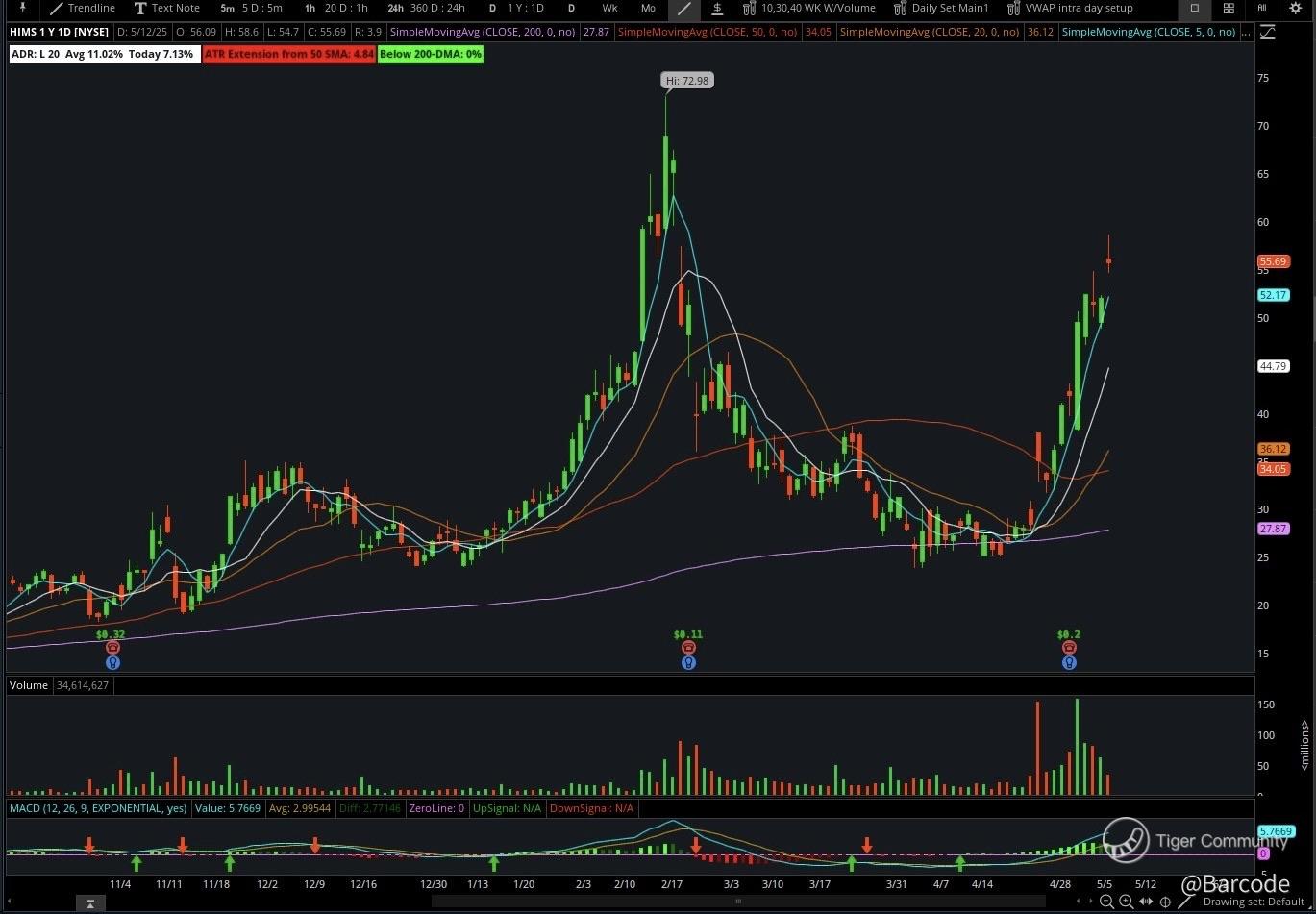 $HIMS has doubled YTD and exploded 135% in just 14 sessions, piercing through prior resistance with conviction. Friday’s intraday high hit $58.60, confirming a high-volume surge to levels not seen since early 2024.