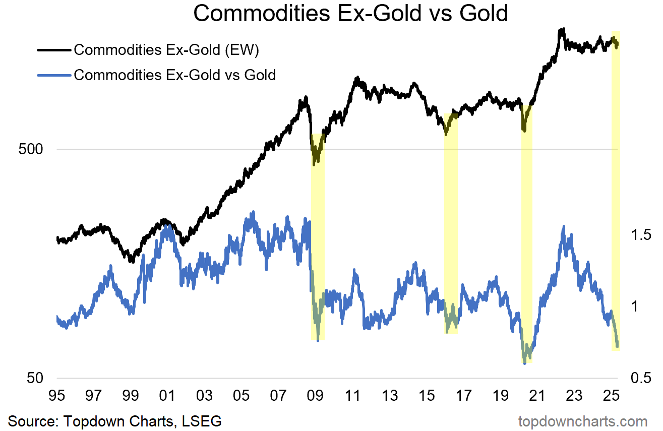 On that note, here’s an old favorite chart of mine — it shows the equal-weighted price index of commodities ex-gold, and the ratio of that index vs the gold price. There seems to be a pattern here of extreme underperformance by the rest of commodities vs gold (highlighted yellow) being a bottoming/cyclically bullish signal for commodities.