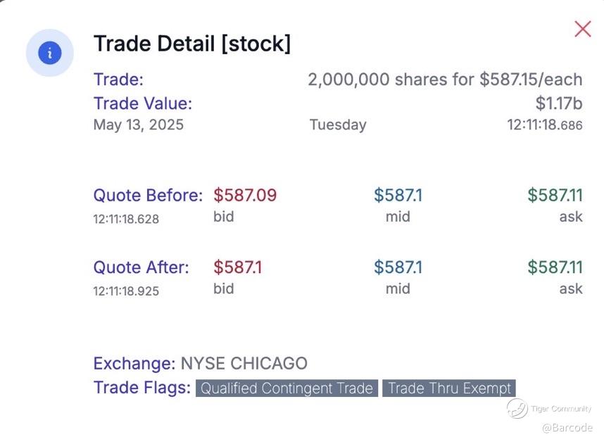 Then came the crescendo: a $1.17 billion block routed through NYSE Chicago at $587.15. Tagged as a Qualified Contingent Trade, this wasn’t noise, it was a message!