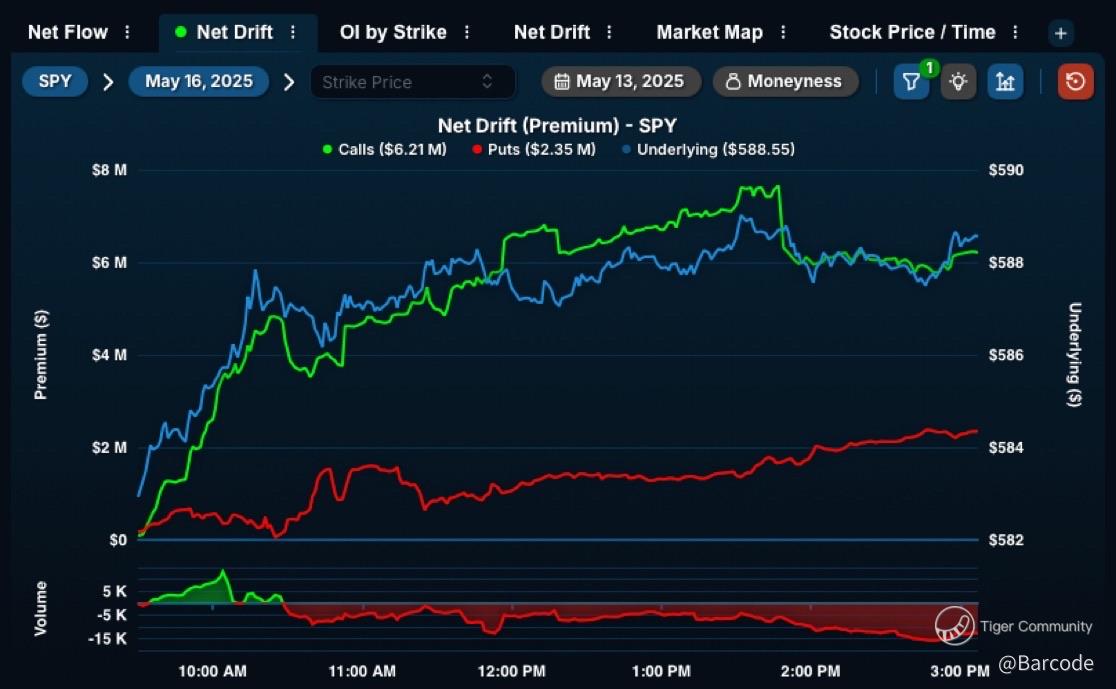 Today wasn’t just bullish, it was choreographed. $SPY’s 16May25 calls exploded with over $4 million in net premium by mid-session, outpacing puts in a vertical divergence straight off the open. That green line didn’t meander, it surged with institutional intent.