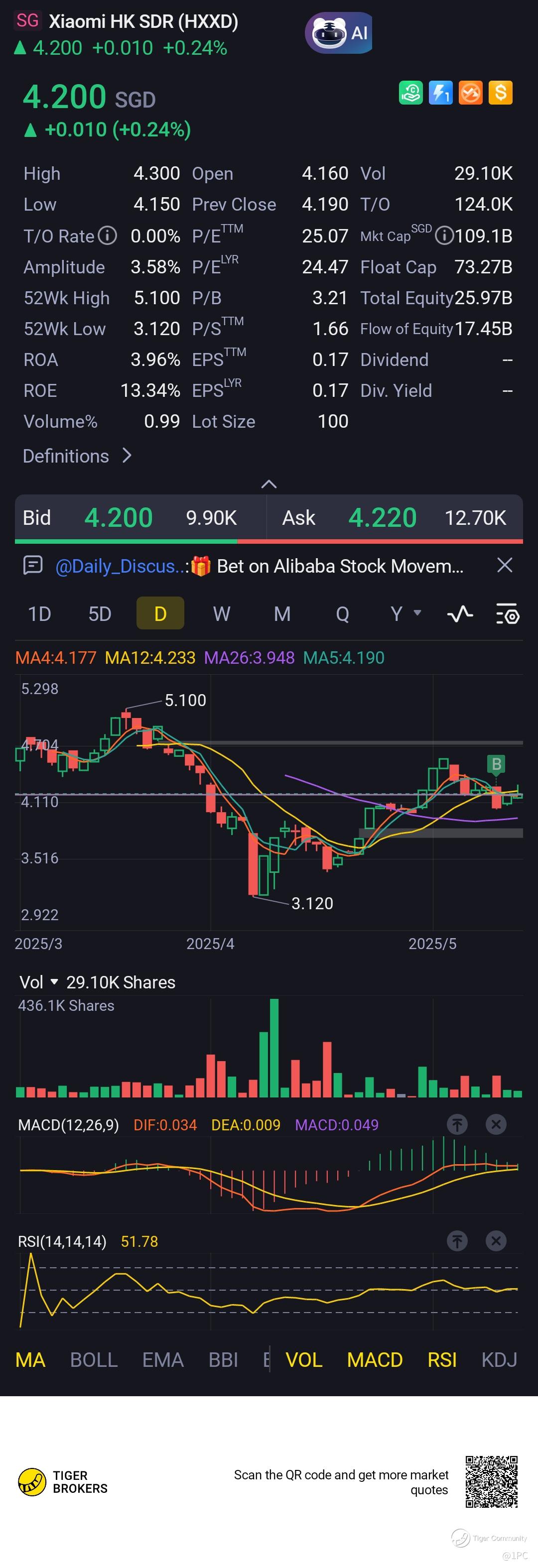 $Xiaomi HK SDR 2to1(HXXD.SI)$ I have been monitoring$Xiaomi HK SDR 2to1(HXXD.SI)$ for a period of time and decided to take a leap of faith on Tuesday 13 May with the Large Brarisk K line [OMG] ... RSI at this date is still above 50 level, Volume is a Large Volume Bar too [Thinking] ..... Could Banker are doing something here. ... I find that this is abnormal & try a Test position [Bless] .... MA26 still has some time to go in order to do its job while the others MAs looking Good 😊 too, slowly lineups to "Sadie-Ya" soon [Chuckle] [Chuckle] [Chuckle] . IF I'm Right 👍, I will be getting Ready to Add [Call] [Allin] . Let's see how it work out this week 😉.