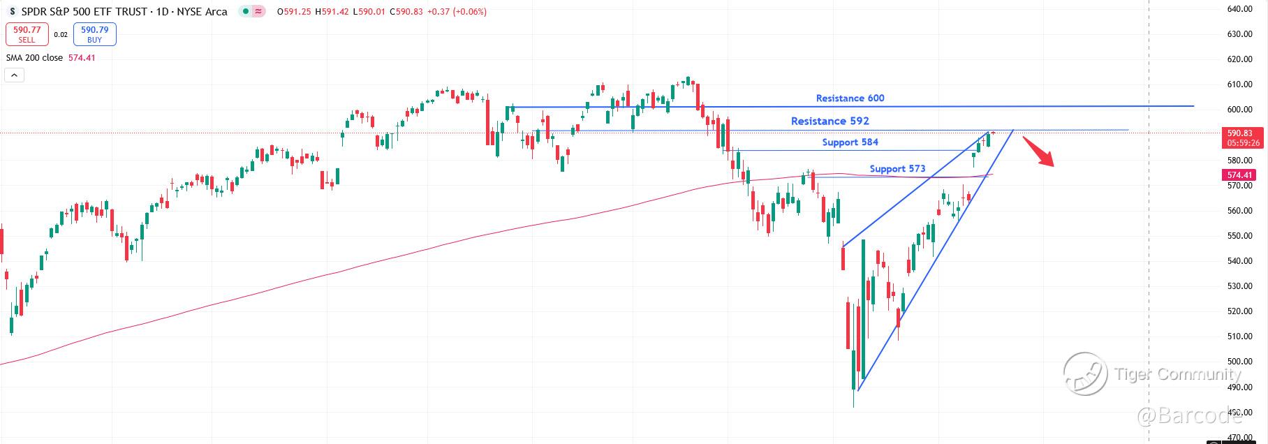 SPYโs price action has me glued to the charts. Itโs currently tracing the upper boundary of a rising wedge, a pattern thatโs been tightening over weeks. For the uninitiated, a rising wedge features converging trendlines sloping upward, often a prelude to a reversal when momentum fades. Right now, the resistance sits at $593.60, just a hair above todayโs price, while support looms at $584, with the 200-day simple moving average at $574.41 as a deeper backstop. Volume has been thinning as the price climbs, a classic sign of hesitation that could tip either way.
