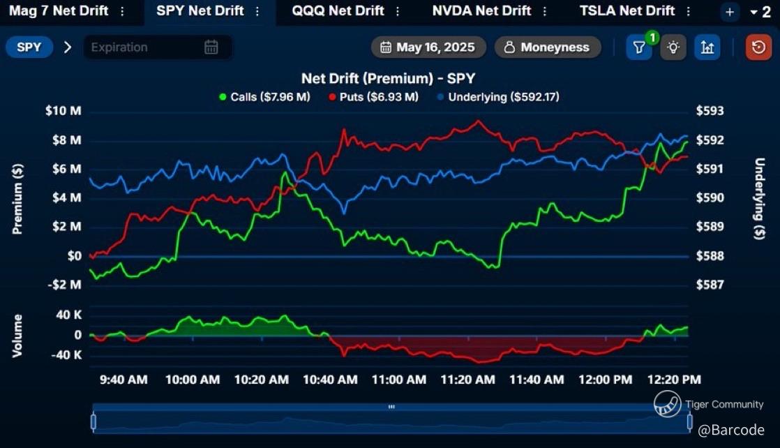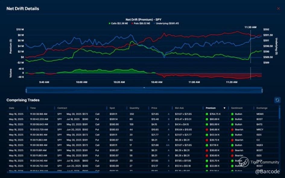 The options tape is buzzing, and itโs telling a story of confidence. On 16May25, we saw a $3 million spike in intraday call volume, flipping the flow balance decisively bullish. The FlowAlgo Net Drift pegs calls at $7.96 million against puts at $6.93 million, while Flowtopia data shows put unwinds kicking off at 12:30 PM ET, followed by a surge in bullish bets. The bid-ask spread is a razor-thin $0.02, a signal of institutional muscle and liquidity floodgates wide open.