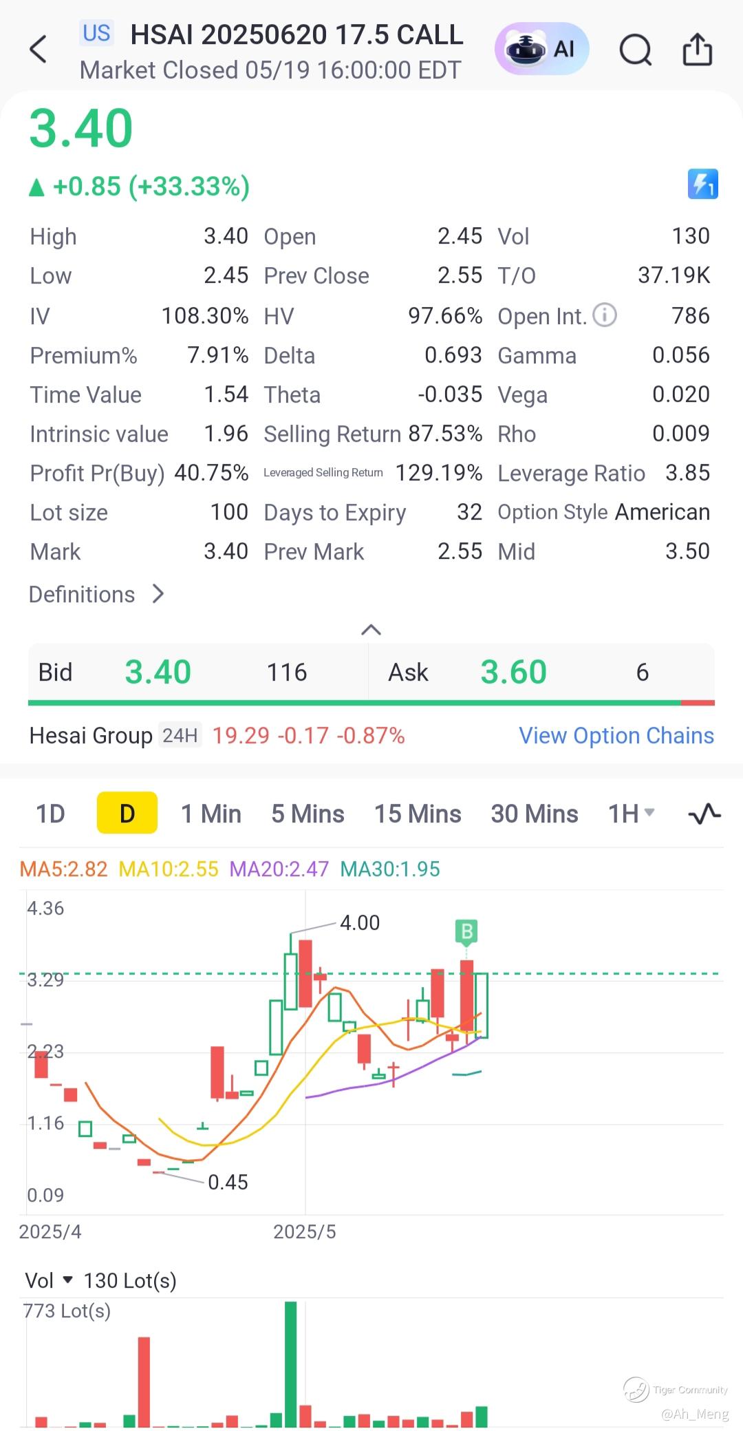 $HSAI 20250620 17.5 CALL$ Nothing to see here. Another call option trial. Is this plain dumb luck? I would continue to believe so until I can finally establish some sort of consistency.