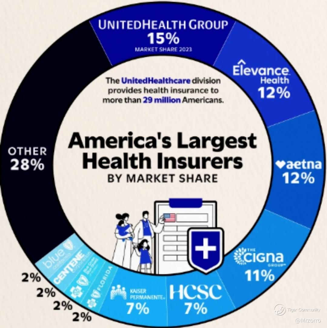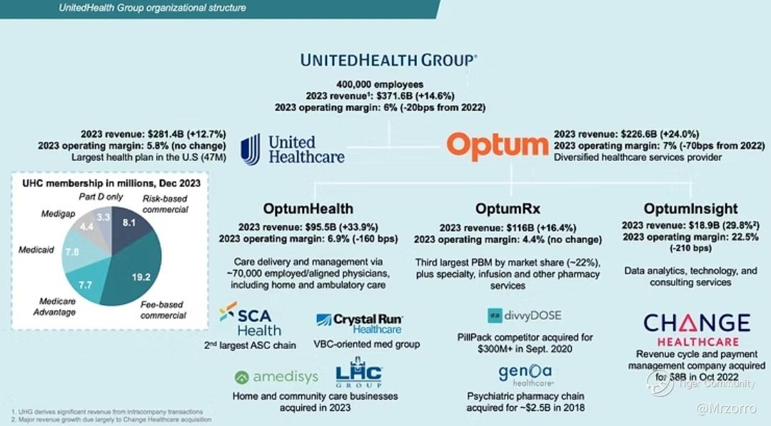 Insurance: UnitedHealthcare provides medical insurance to four main customer segments: "Employer & Individual," "Medicare & Retirement," "Community & State Medicaid," and "Global." This core business accounts for about 57% of the company's revenue. Although UNH is the largest health insurer in the U.S., its market share is only around 15%, with the top five companies holding 57% of the market, indicating a relatively fragmented industry.