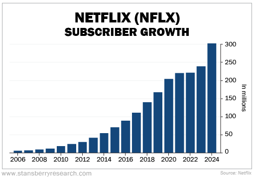 Around the turn of the century, it had just 400,000 subscribers. Today, that number has exploded to nearly 302 million... a staggering 75,558% increase. Take a look...