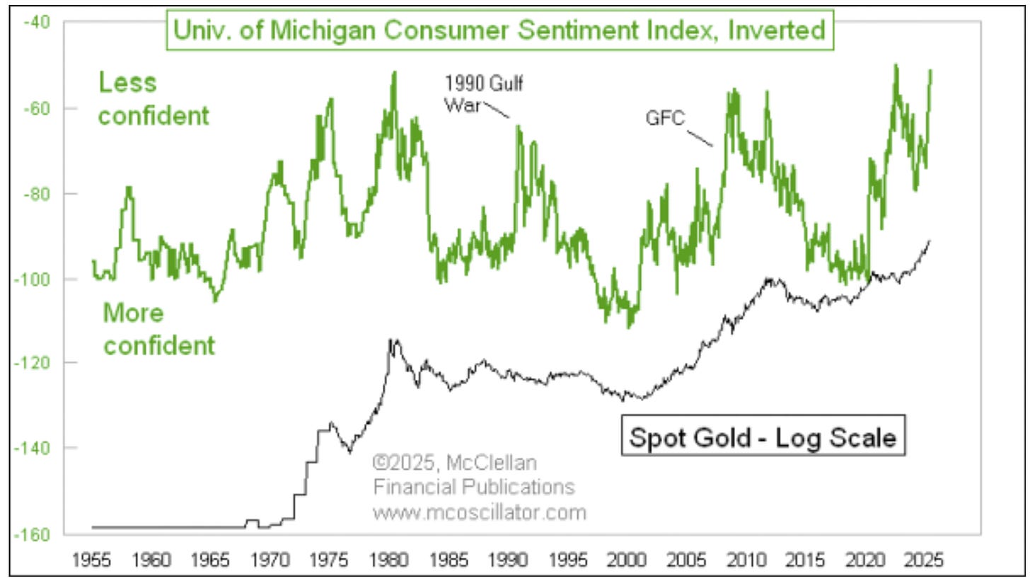 Lastly, another interesting gold-driver chart; aside from geopolitics, the ebb and flow in consumer sentiment has historically also been a major driver (particularly now in the age of chaos). But an important implication of this is also that when uncertainty calms and chaos resolves and consumers start to feel more confident again, the gold price could well take a step back (something to keep in mind from the risk management side of things).