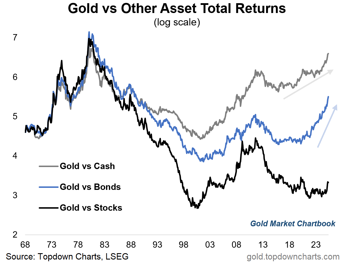 And that reminds me of one of my other big favorite charts; gold vs cash, bonds, and stocks. Gold started trending up vs cash first, and then bonds (with gold outperforming bonds in spectacular fashion), and then only more recently gold starting to stir vs stocks.