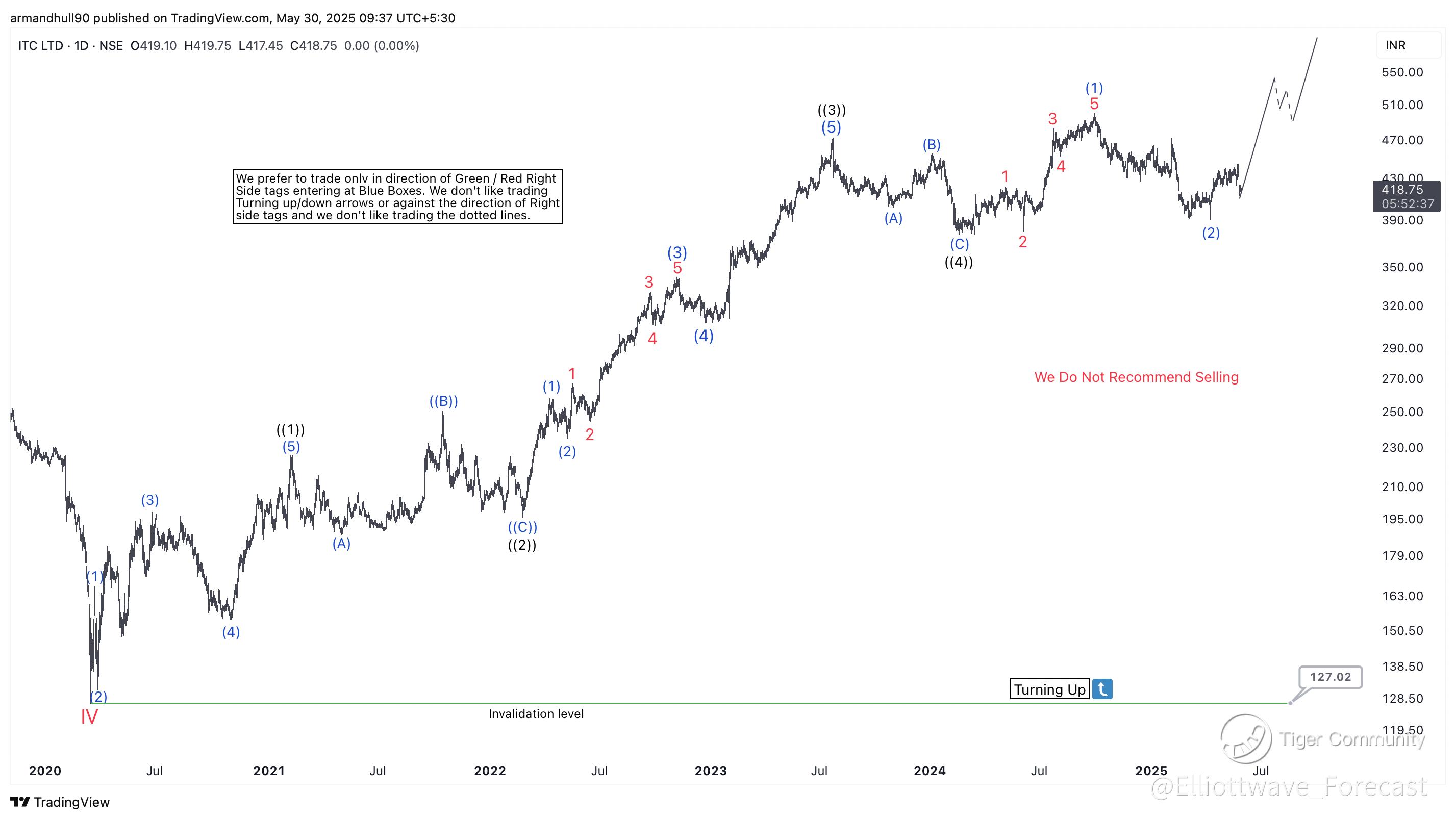 The Daily chart adds further confirmation. Following the low of wave IV in 2020, ITC has developed a clean impulsive advance with several subwaves already completed. The latest correction labeled as wave (2) within ((5)) seems to be finishing, setting the stage for a bullish breakout toward the 500–550 INR region in the coming months.