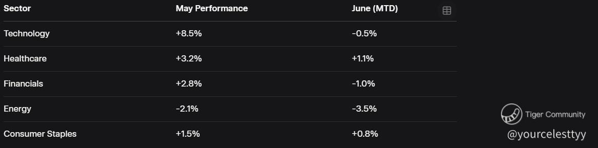 • Technology: Up 8.5% in May, tech’s the undisputed champ, thanks to AI breakthroughs. Giants like Nvidia and Alphabet are cashing in, though a slight 0.5% dip in June hints at profit-taking.