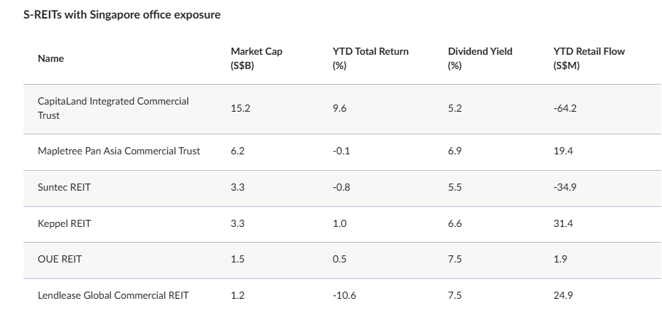 The six S-REITs with Singapore office exposure — CapitaLand Integrated Commercial Trust (CICT), Mapletree Pan Asia Commercial Trust (MPACT), Suntec REIT, Keppel REIT, OUE REIT, and Lendlease Global Commercial REIT (LREIT) — recorded positive rental reversions for their local office assets, with some achieving double-digit growth.