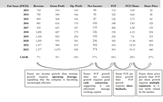 This example is from the credit score company $Fair Isaac(FICO)$ . Notice how their growth rates increase as you move from revenue to share price.