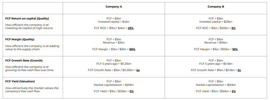 Company A and Company B both make $1bn in free cash flow (FCF). Comparing a company’s FCF to its invested capital, revenue, historic FCF and market capitalisation reveals four important investing ratios.