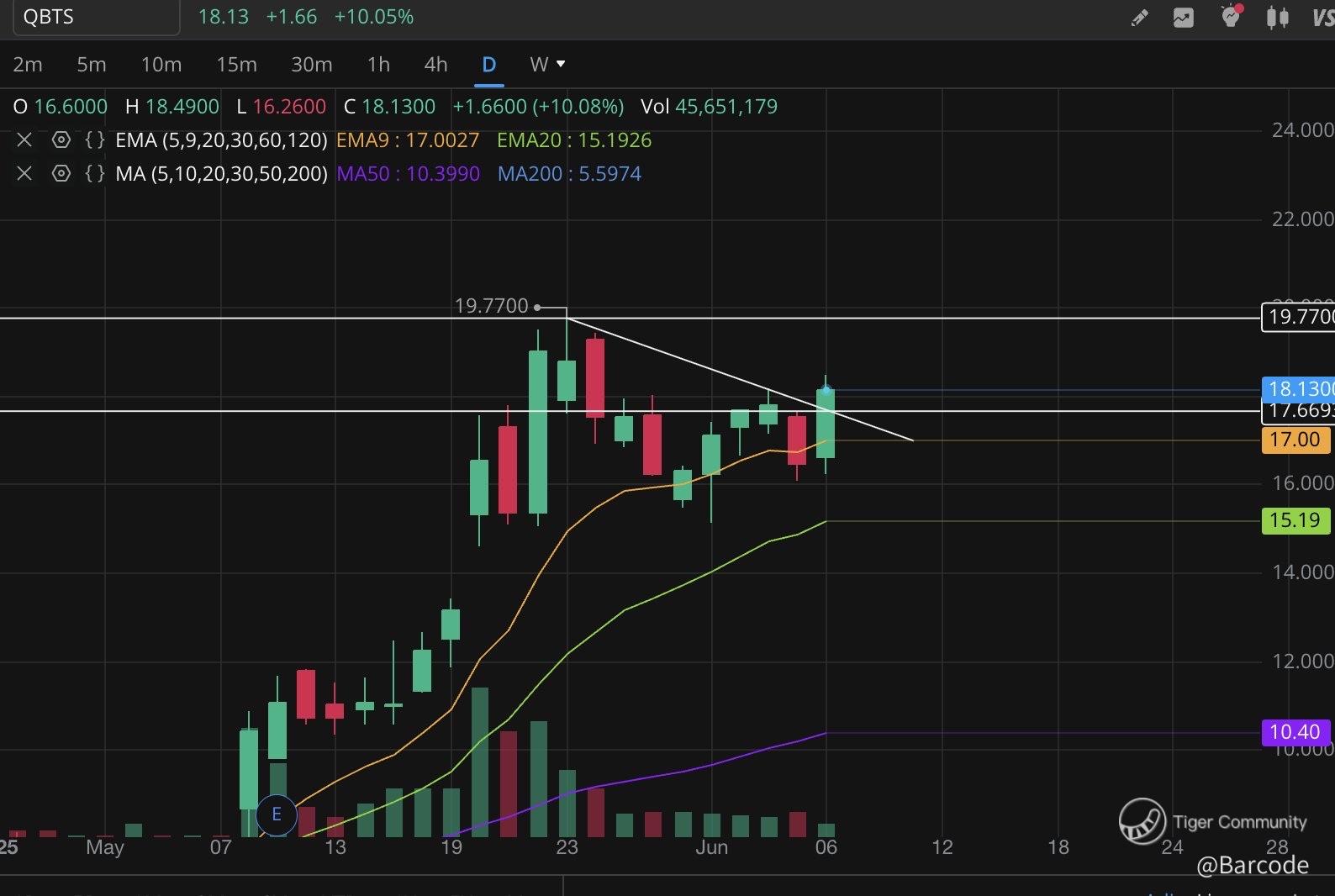 But instead of breaking down, $QBTS reversed hard. It reclaimed its trendline, surged above the 9EMA, and cleared back into the June Value Area, a key zone formed from May’s high-volume consolidation.