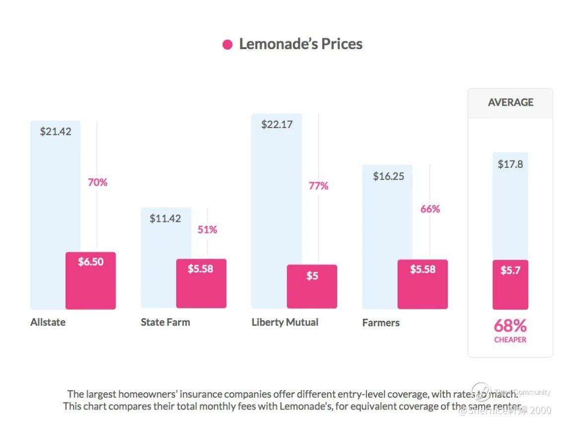 Lemonade's prices range from $5 to $5.58 monthly, significantly lower than competitors ($11.42 to $22.17), with savings of 51% to 77% and an average of 68% cheaper.