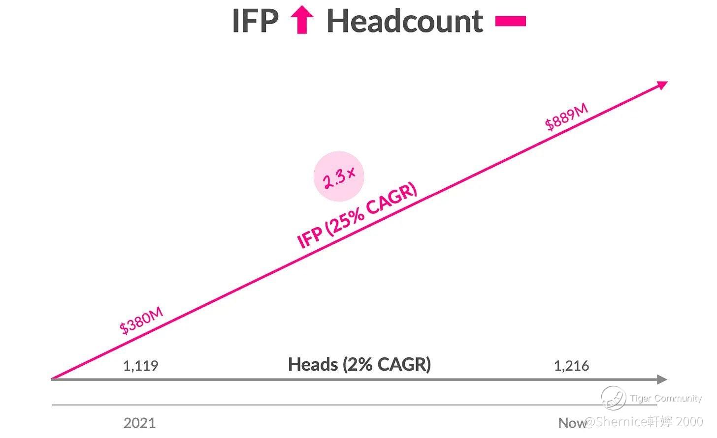 IFP grows from $380M to $889M with a 25% CAGR, while headcount rises from 1,119 to 1,216 with a 2% CAGR, indicating a 2.3x IFP growth relative to headcount.