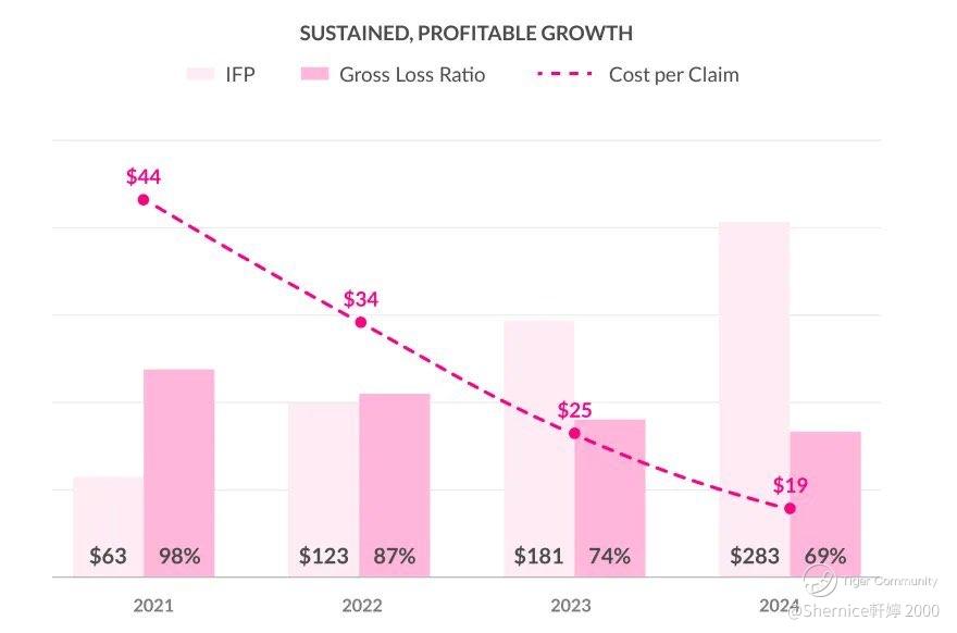 IFP increases from $63M (2021) to $283M (2024), with a declining Gross Loss Ratio (98% to 69%) and Cost per Claim (from $44 to $19).