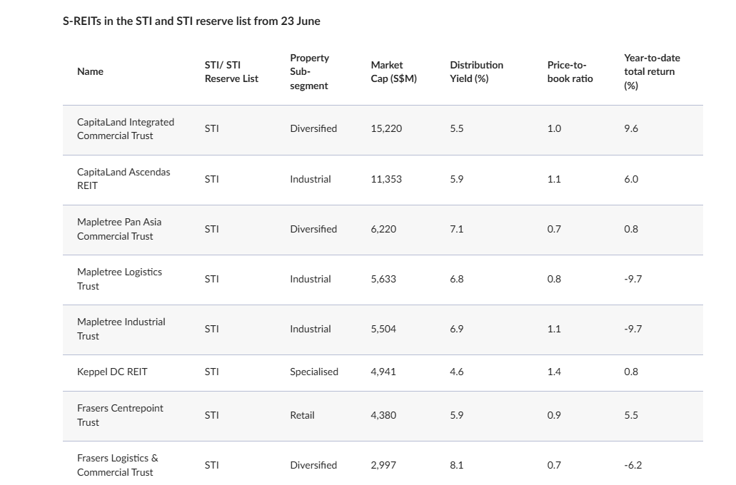 The eight S-REITs in the STI will be: $CapLand Ascendas REIT(A17U.SI)$ $CapLand IntCom T(C38U.SI)$ $Frasers Cpt Tr(J69U.SI)$ $Frasers L&C Tr(BUOU.SI)$ $Mapletree Ind Tr(ME8U.SI)$ $Mapletree Log Tr(M44U.SI)$ $Mapletree PanAsia Com Tr(N2IU.SI)$