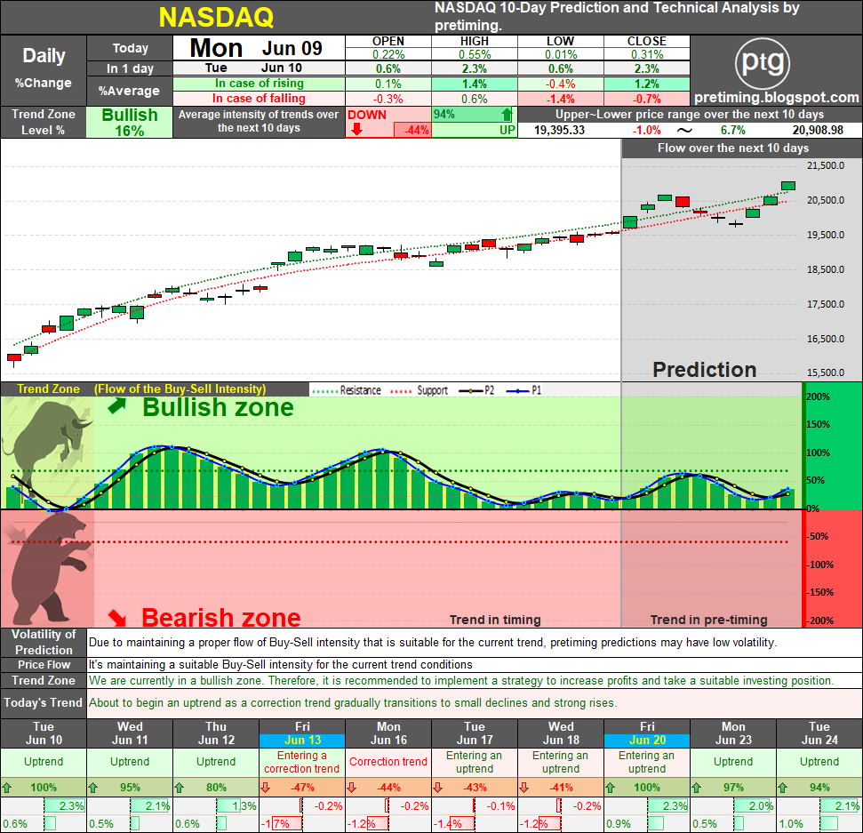 The NASDAQ closed slightly higher on Monday at 19,591.2, marking a continuation of the bullish trend with moderate upward momentum. Market sentiment remains positive, driven by consistent buying strength and a lack of bearish signals in the near-term horizon. Notably, the probability of entering a bearish trend zone within the next 10 days has dropped to 0%, reinforcing confidence in the ongoing uptrend.