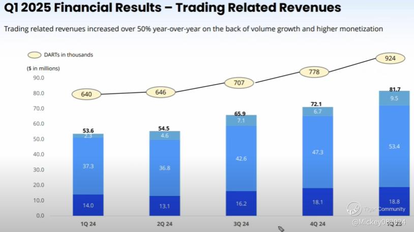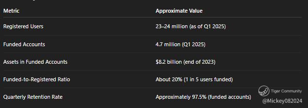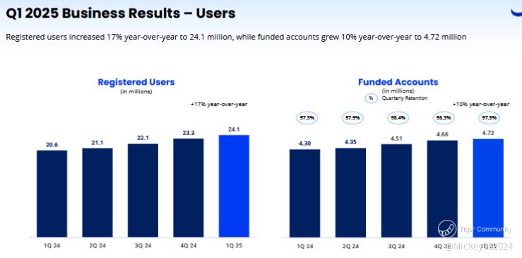 The platform’s high retention rate (reported around 97.5% quarterly retention for funded accounts) suggests that once users fund their accounts, most tend to stay engaged. However, the slightly slower growth in funded accounts relative to registrations indicates there may be some users who sign up for incentives or exploratory purposes but delay or decide against funding their accounts.