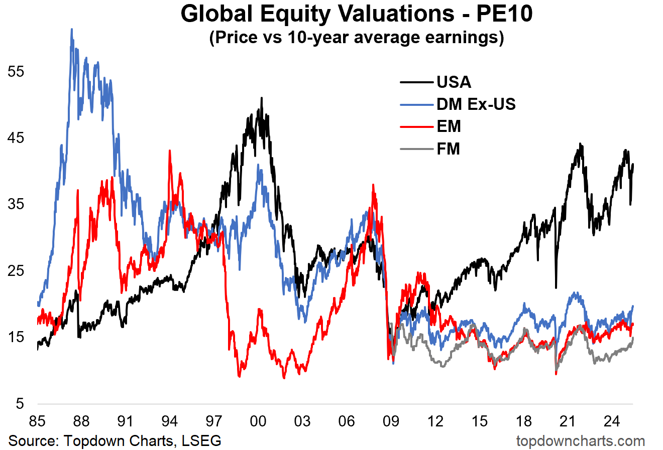 The thing that immediately stands out is the gap between all the other major chunks of global equities vs the USA. But also, the fact that all 3 of those lower lines are lower than usual… basically cheap vs their own history.