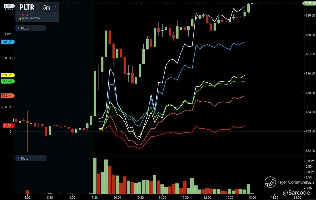 On shorter timeframes, the story sharpens. The hourly chart shows a breakout from a descending broadening wedge, confirmed by a volume spike exceeding 918K shares in a single 5-minute bar as price hit $139.64 intraday. The 1.272 Fibonacci extension at $141.78 looms as immediate resistance. A decisive break could accelerate momentum and force shorts to cover.