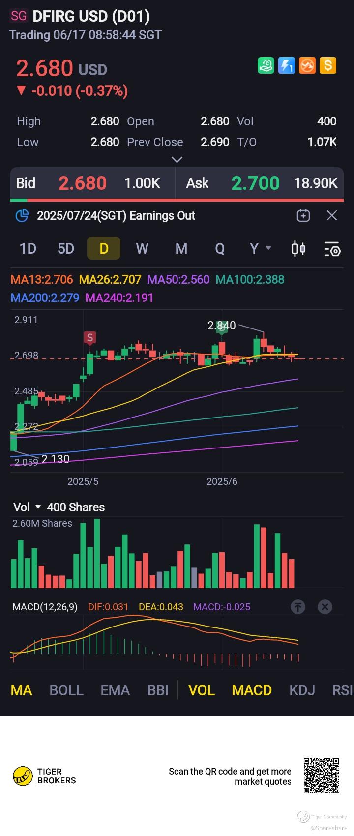 $DFIRG USD(D01.SI)$ DFI Retail Group (D01.SI) She is trading in a consolidation mode price patterns, likely to rise up to test 2.84 again!