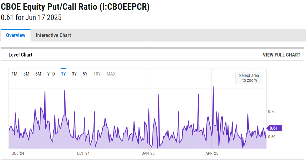On June 17, 2025, the equity-only put/call ratio was 0.61. This means that there are about 61 puts for every 100 calls on single-stock options.